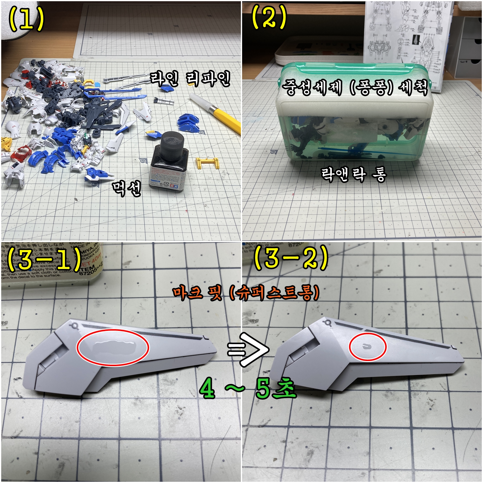 이전 테스트용으로 가조로 만들어서 세워 두었던 것들 전부 그냥 몸통 팔 다리 이렇게 크게 분해해서 위와 같은 방식으로 세척했습니다.