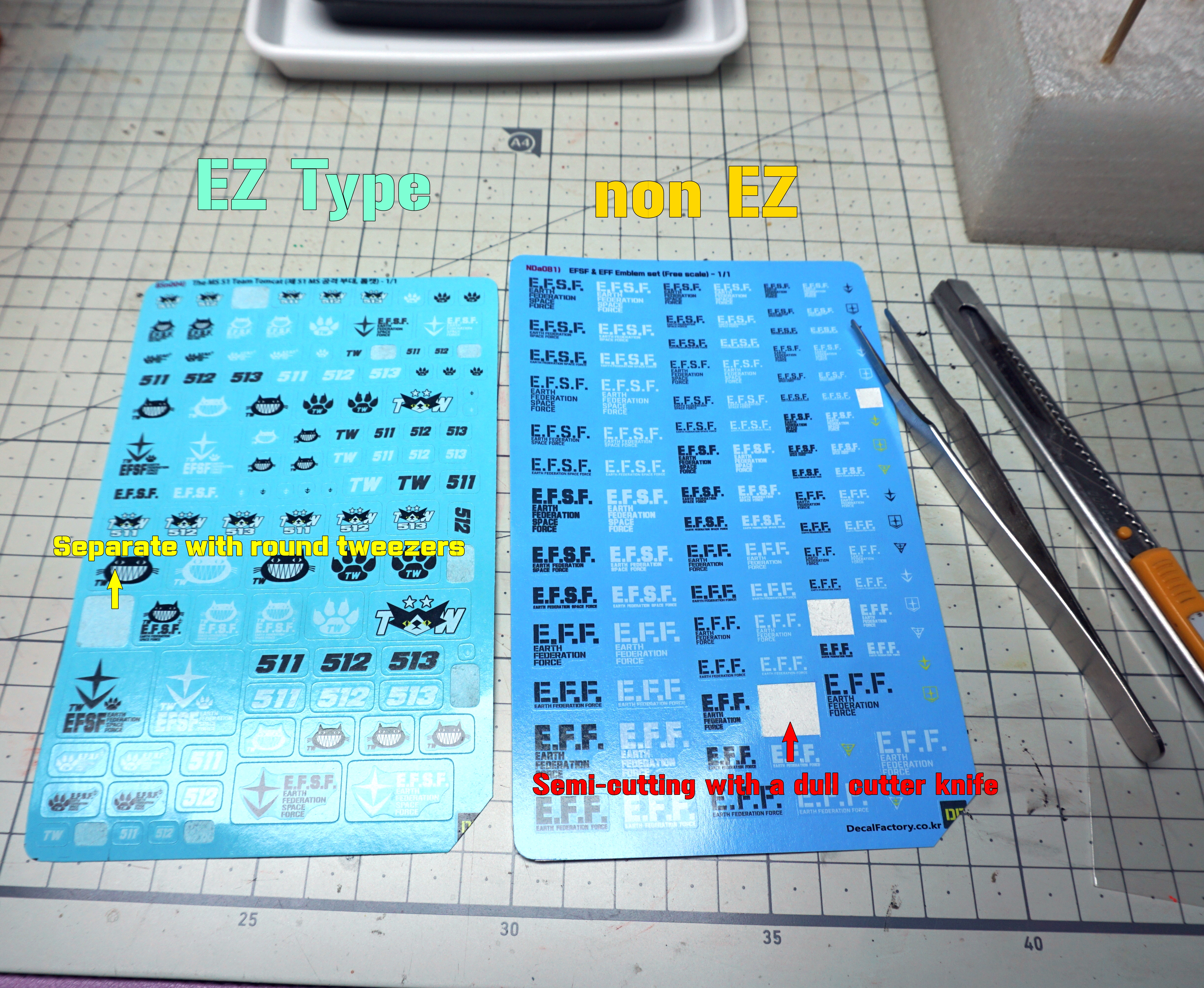 이지 타입이 아닌 데칼은 약간 무딘 칼로 반컷 내서 이지 타입 처럼 사용하면 편합니다.