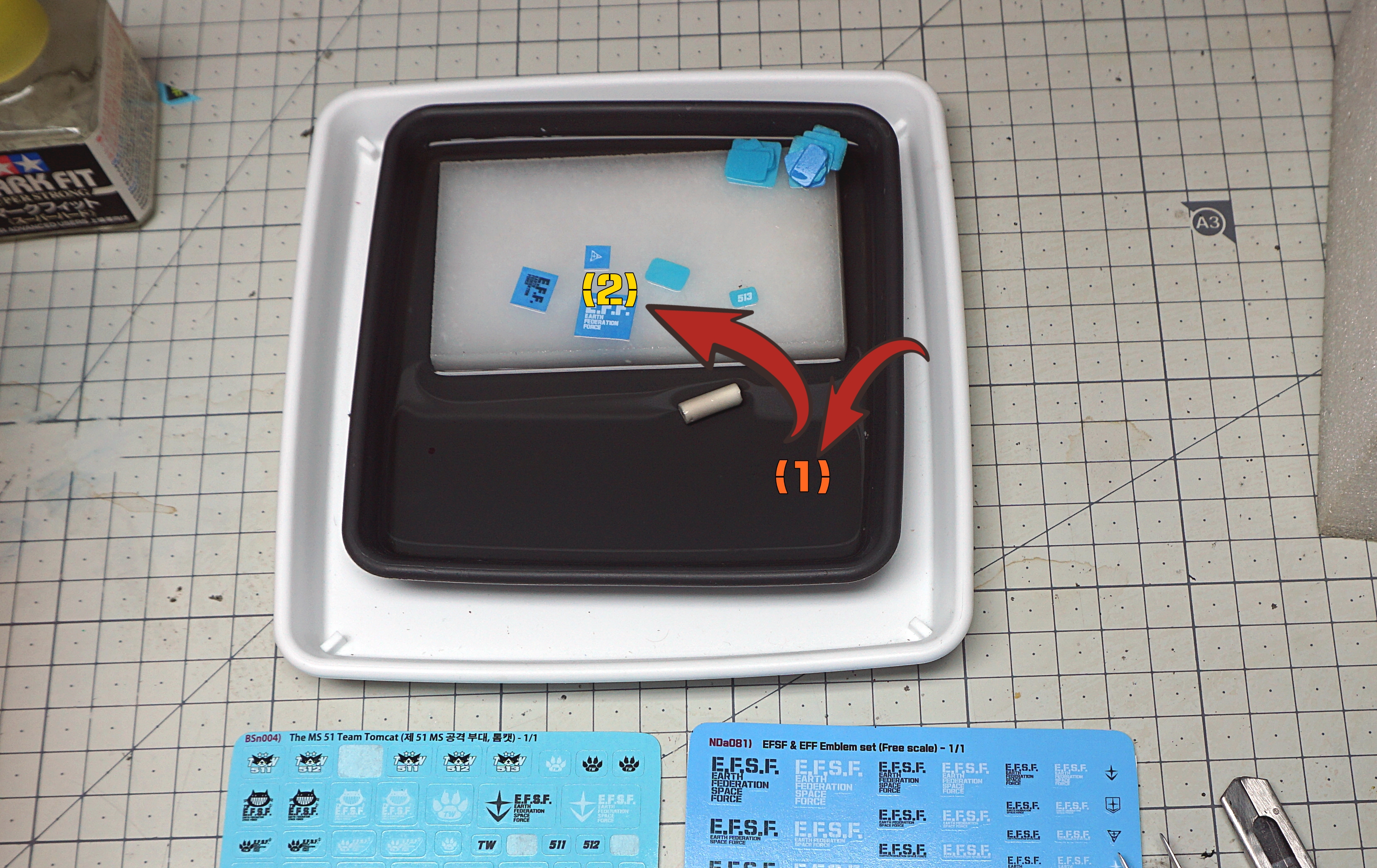 그 안에 데칼의 위치를 잡고, 잠시 기다려서 데칼 연화제가 작동될 타이밍을 준 후 물기를 제거하고 최종 고정하면 됩니다.