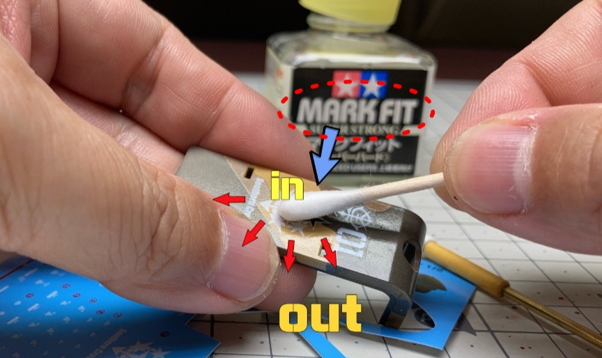데칼 연화제를 최종 고정된 데칼 위에 살짝 바르고, 면봉을 사용해서 안에서 밖으로 닦아내는 느낌으로 표면을 정리하면 됩니다.